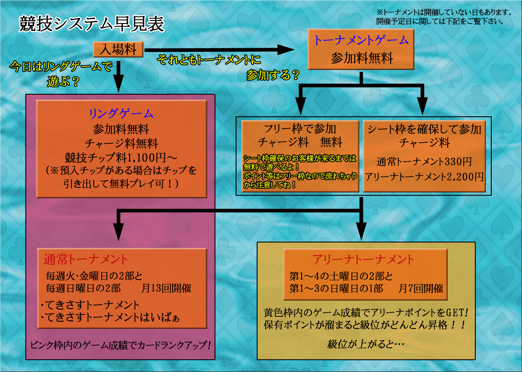 トーナメントに参加される方は参加料は無料で参加出来ますが、フリー枠で参加するか、シート枠を確保して参加するかによってチャージ料が変わってきます。| フリー枠で参加 | シート枠確保で参加 | |